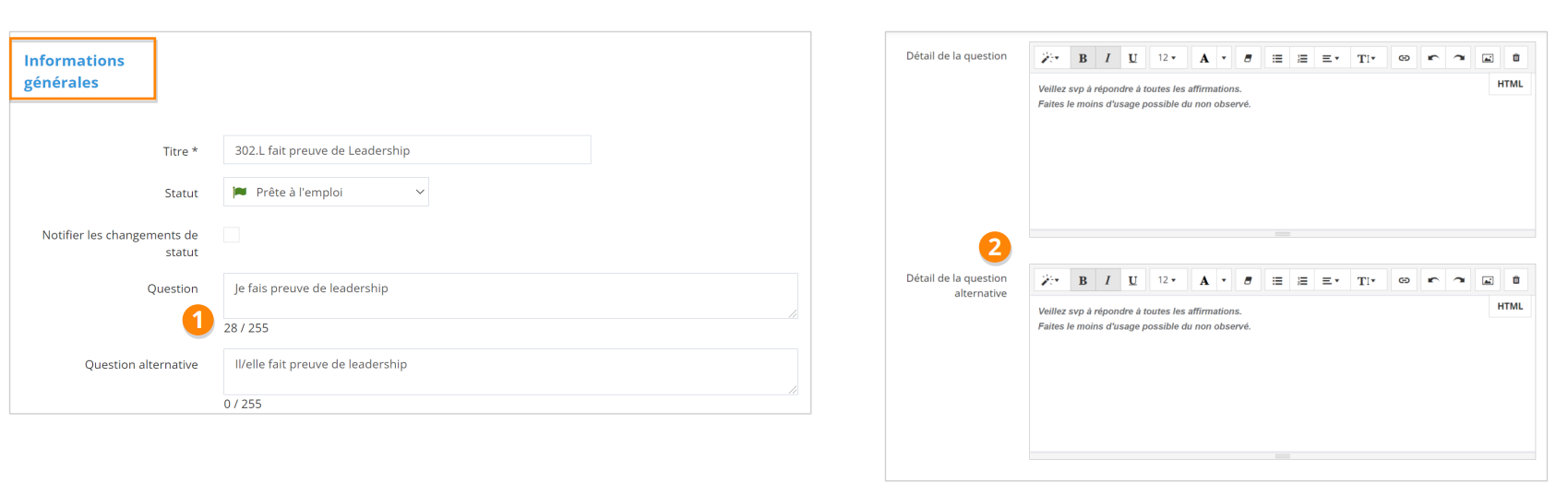Votre échelle de notation est gérée dans les Propriétés / Options Elle doit être strictement identique pour chaque question d’une même épreuve 360 (même nombre d’options, mêmes intitulés)