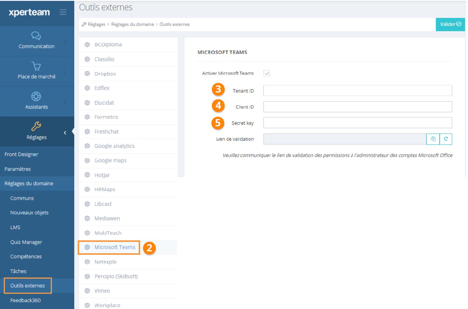 3,4,5/ Reporter les tennant ID, Client ID et Secret key obtenus aux étapes précédentes