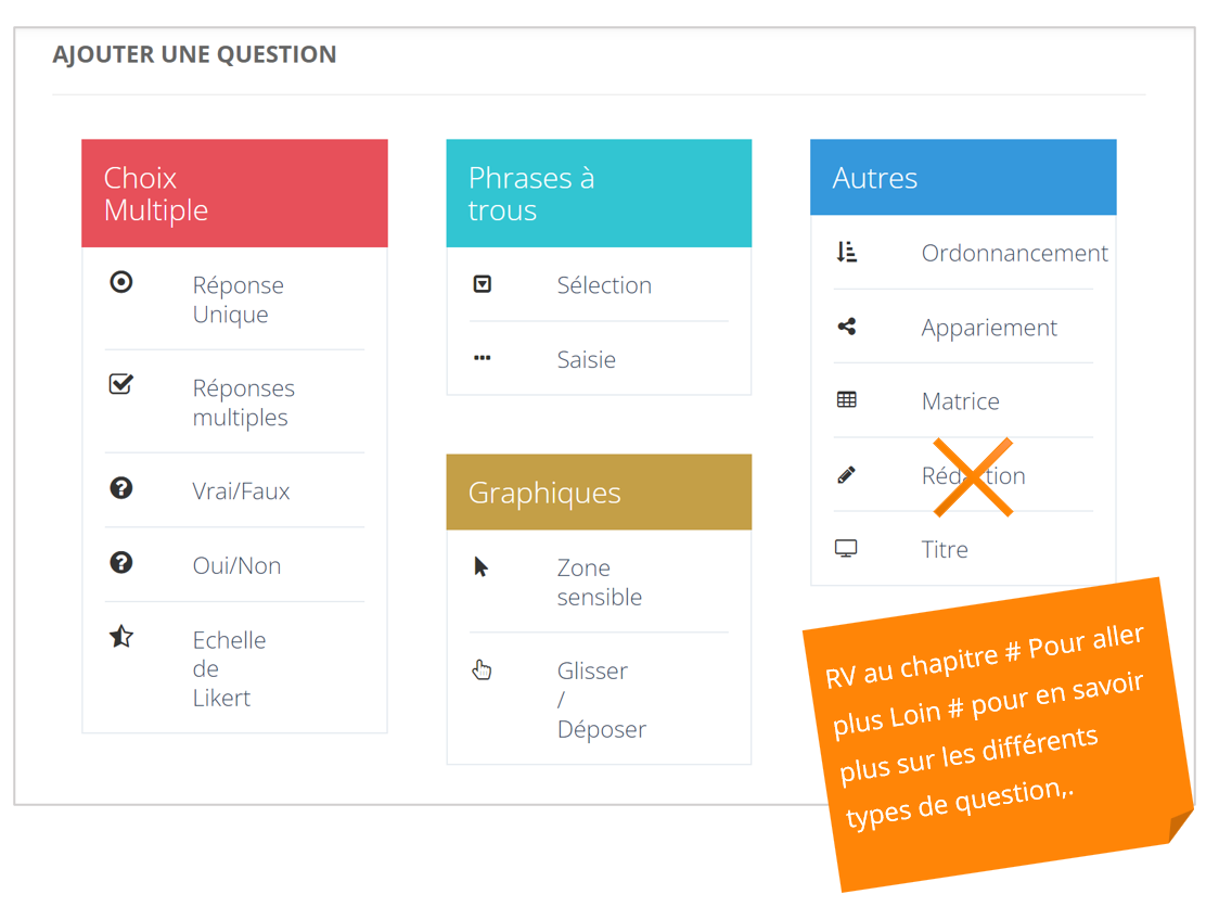 Vous pouvez utiliser tous les types de questions SAUF celles de type Rédaction, qui nécessitent une intervention d’une tierce personne pour la notation de la réponse.