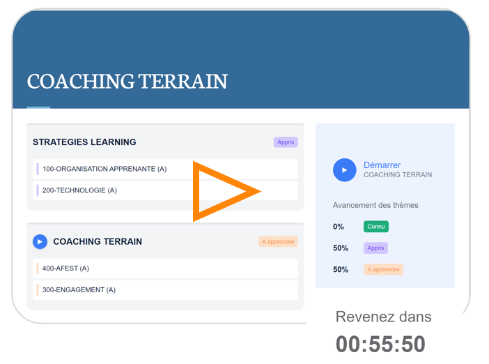 Ici, au prochain lancement de l’épreuve dans le player, une page d’accueil avec un graphe (blocs + thèmes) permet au candidat de voir où il en est. Il peut relancer l’épreuve pour relancer des questions liées aux thèmes « appris » qui ont été remis en statut « à apprendre » (rôle de la durée de mémoire courte).
