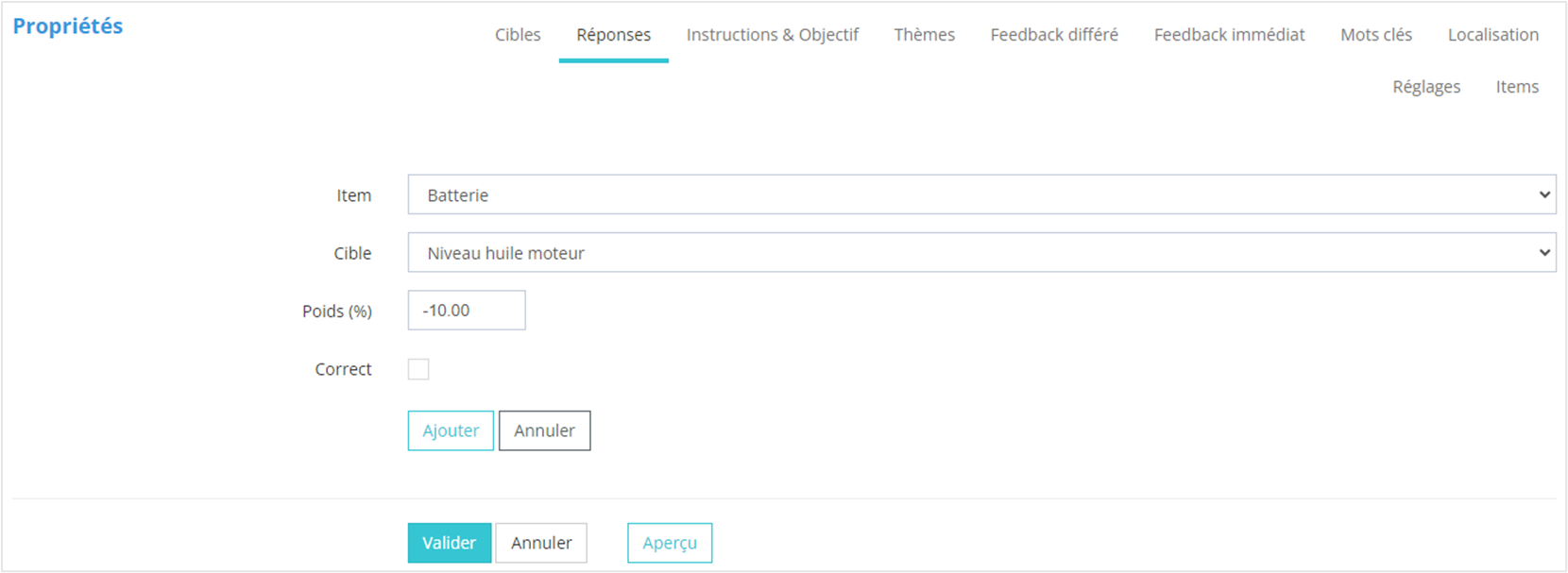 Lors de la création d’une réponse (= association d’un item avec une cible), vous renseignerez :