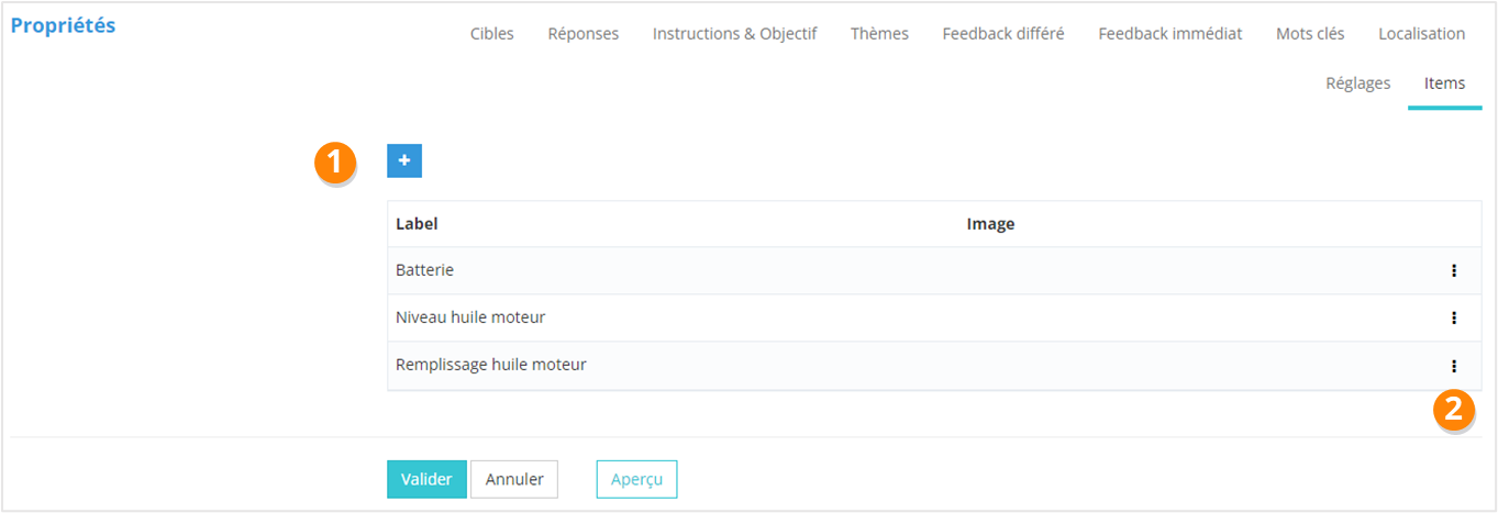 Sur la page Propriétés > Items, vous pouvez :