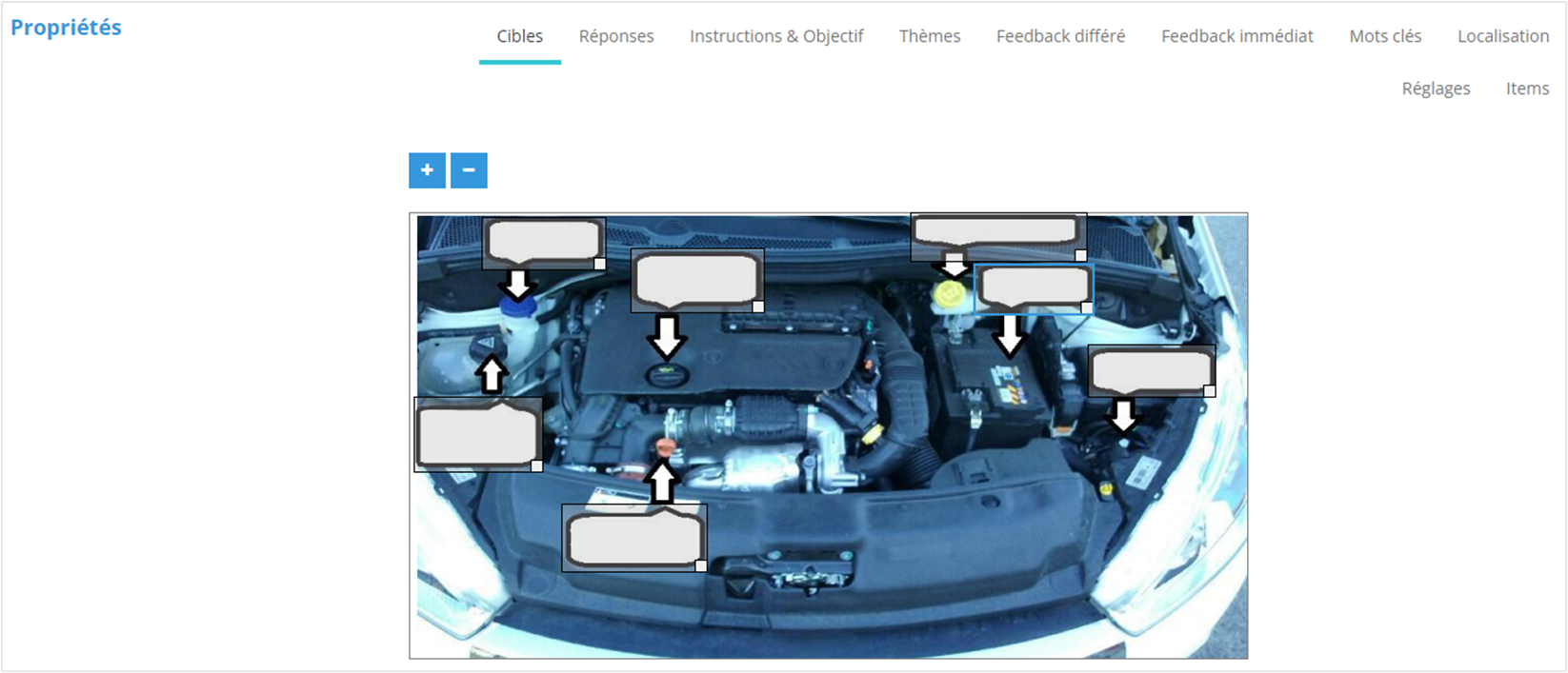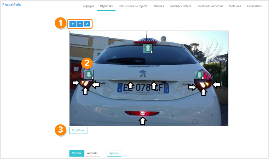 1. Ajouter / Supprimer / Éditer les zones sur lesquelles il faut cliquer en guise de réponse ;