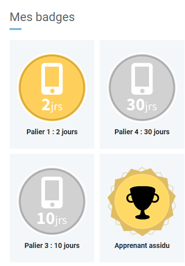 Sur le front office, la page Mes badges permet de retrouver les badges que l’on a obtenu et ceux qui n’ont pas été obtenus en gris.