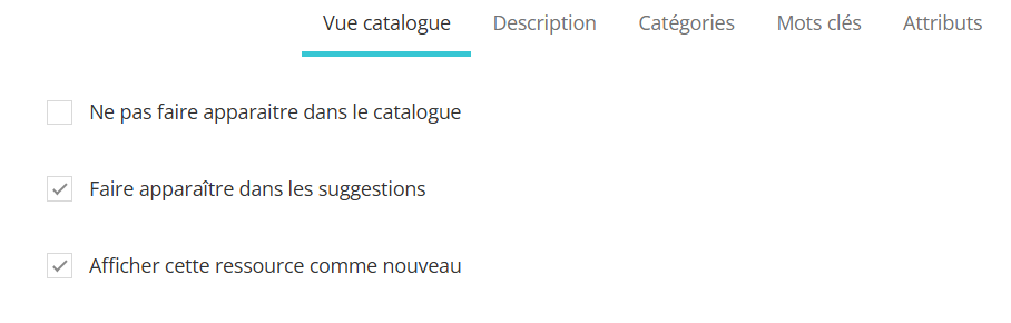 La ressource peut être utilisée comme un contenu indépendant. Dans ce cas, on souhaitera qu’elle apparaisse au catalogue, qu’elle puisse apparaître dans le widget suggestion s’il est utilisé. On pourra également choisir de faire apparaître un bandeau nouveau sur la vignette.