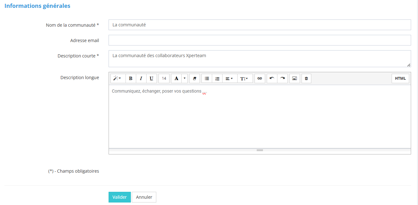 La description courte est limitée à 255 caractère. Elle apparaît sur la vignette de la communauté. Il n’y a pas de mise en forme possible.