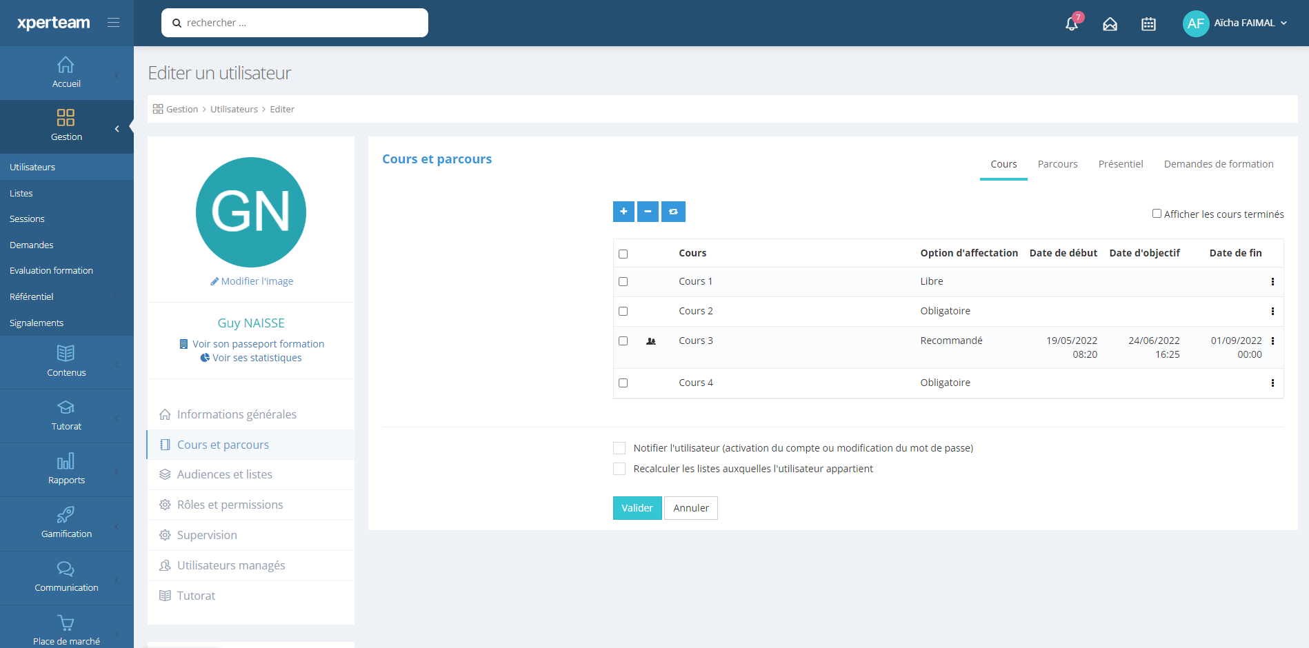 - L’onglet Cours qui permet de voir les cours de l’apprenant, de l’inscrire ou le désinscrire à des cours, de modifier les critères d’affectation aux cours.