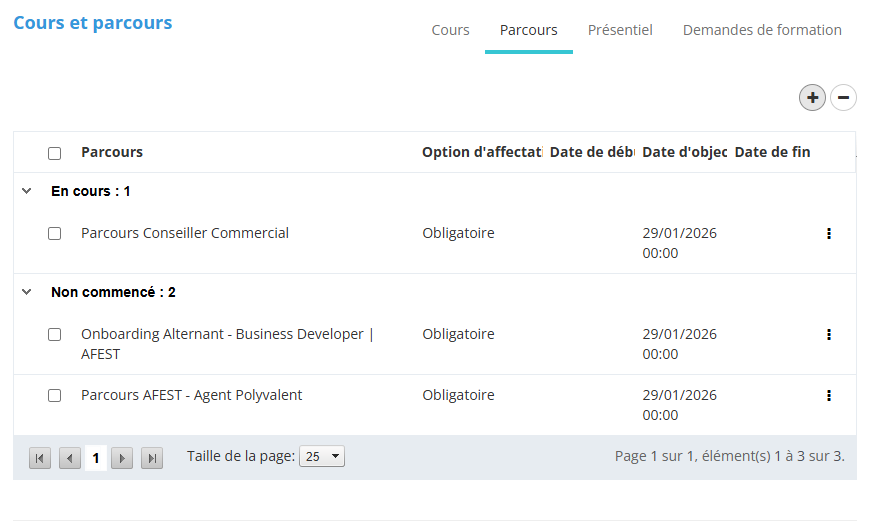 - L’onglet Parcours détaille les parcours auxquels l’apprenant est inscrit.