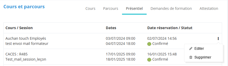 Il est possible de supprimer l'inscription ou de l'éditer pour modifier la session.