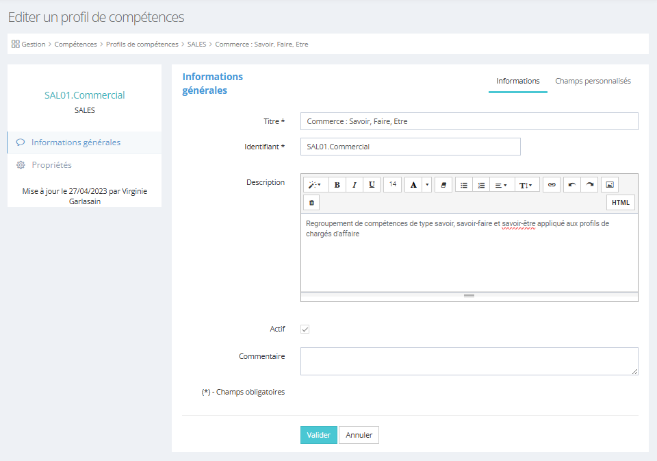 La fiche d’un profil de compétences est structurée en deux onglets principaux : Informations générales et Propriétés.