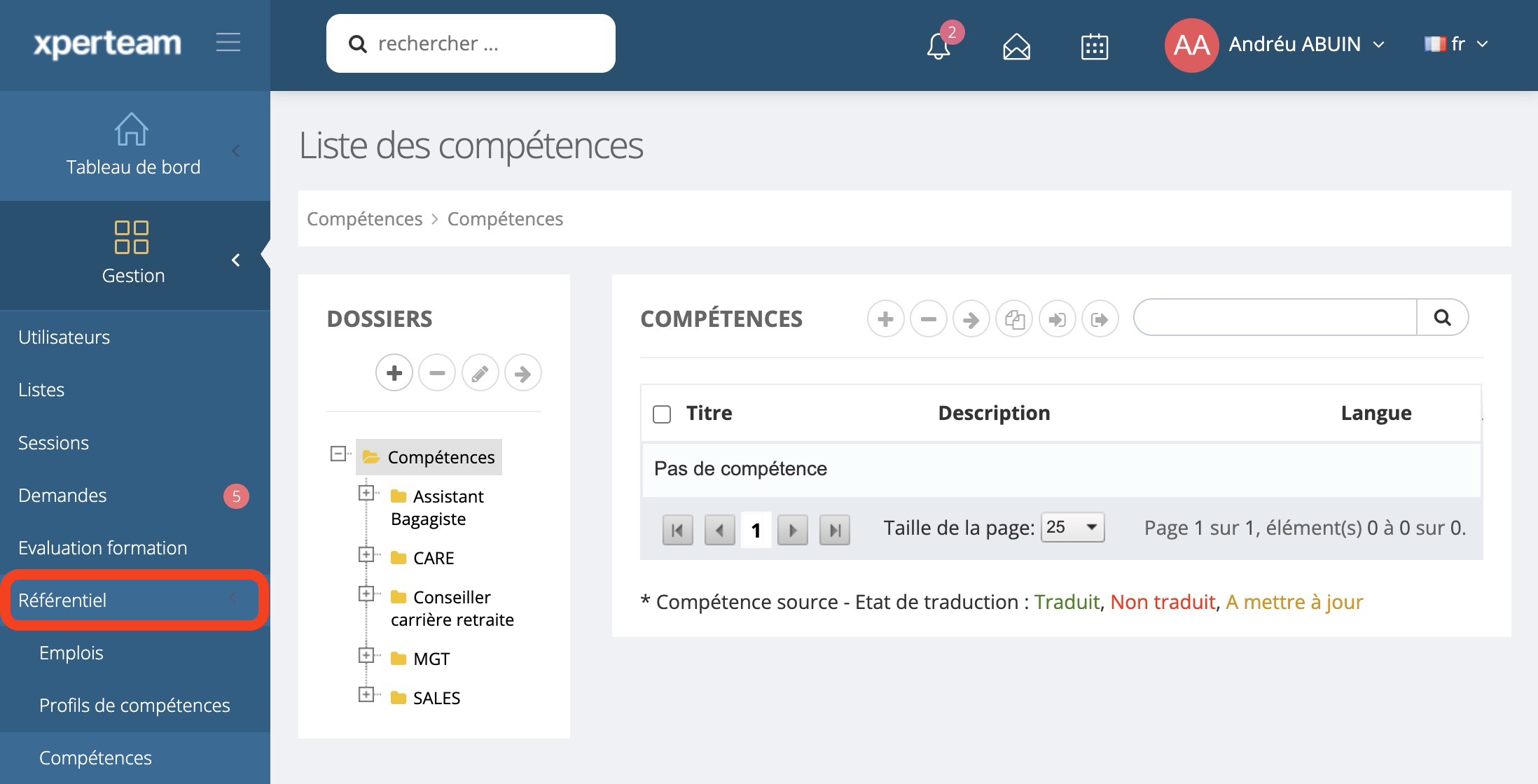 Une fois le module activé sur votre instance xLMS, vous pouvez accéder au référentiel de compétences depuis le menu