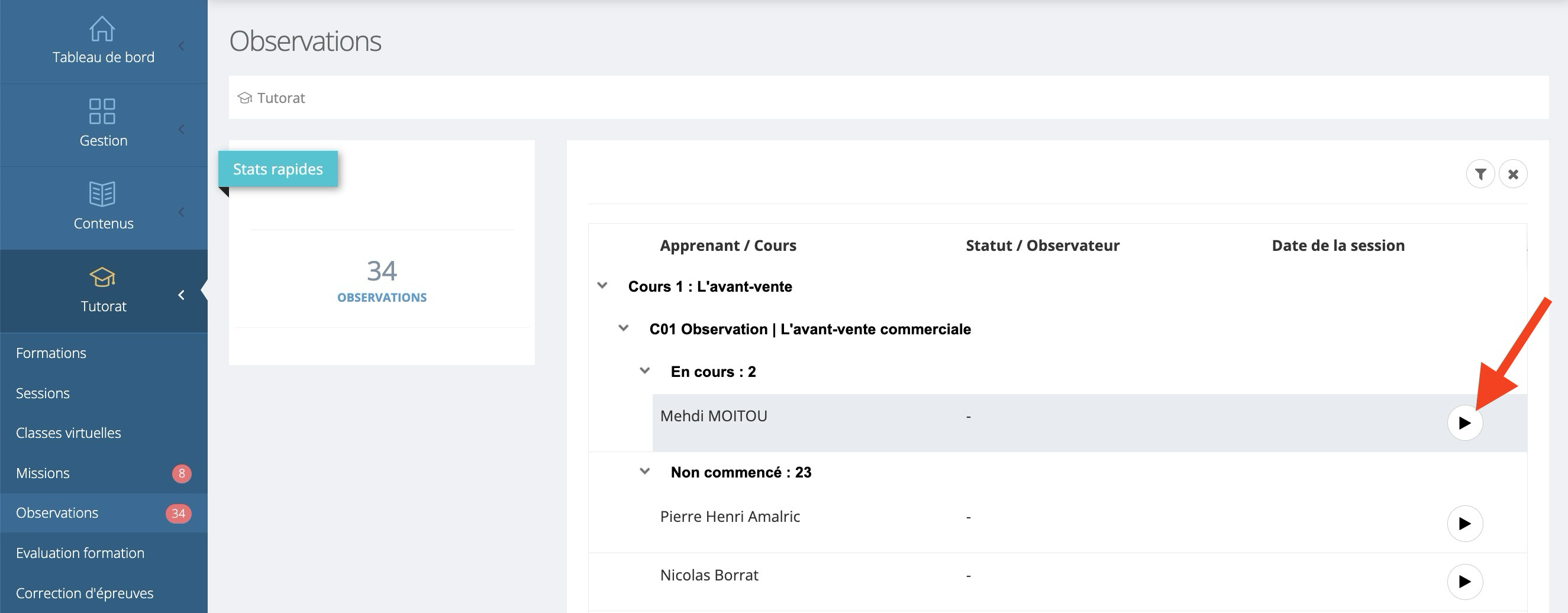 Il leur suffit de se rendre dans l'espace Observations pour retrouver les apprenants qu’il accompagne, puis de lancer une observation afin de les évaluer sur les compétences visées.