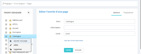 Au niveau de l'onglet Réglages, Front Designer, Pages, il est possible d'ajouter une section "Catalogue".