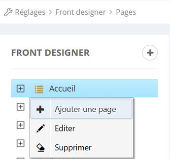 Au niveau de l'onglet Réglages, Front Designer, Pages, après avoir sélectionné la section où l'on souhaite ajouter cette page, on clique doit sur la souris et "ajouter une page".