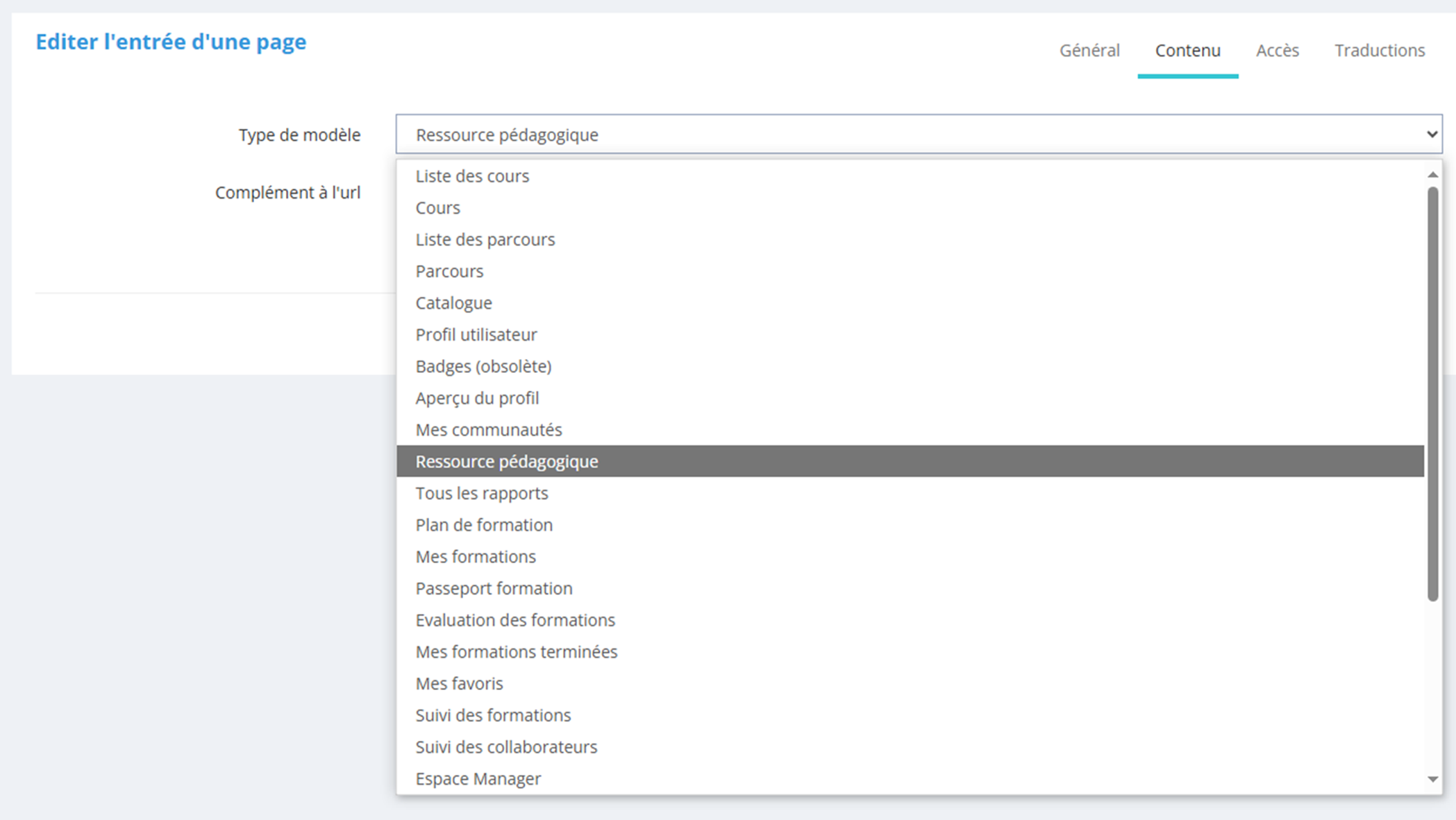 Dans l'onglet contenu, on choisit parmi la liste le type de modèle "Liste de parcours" et on clique sur valider |