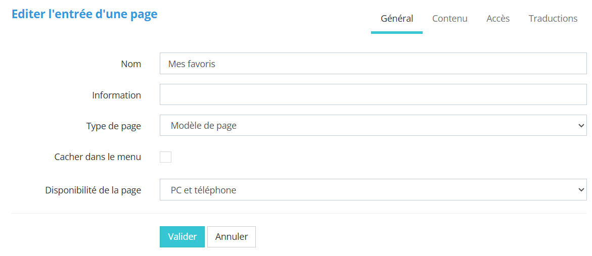 Dans l'onglet contenu, on choisit parmi la liste le type de modèle "Mes favoris " et on clique sur valider. |