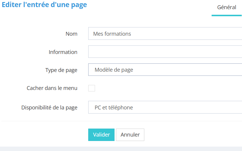 Dans l'onglet général, on choisit le nom et on sélectionne le "modèle de page". |