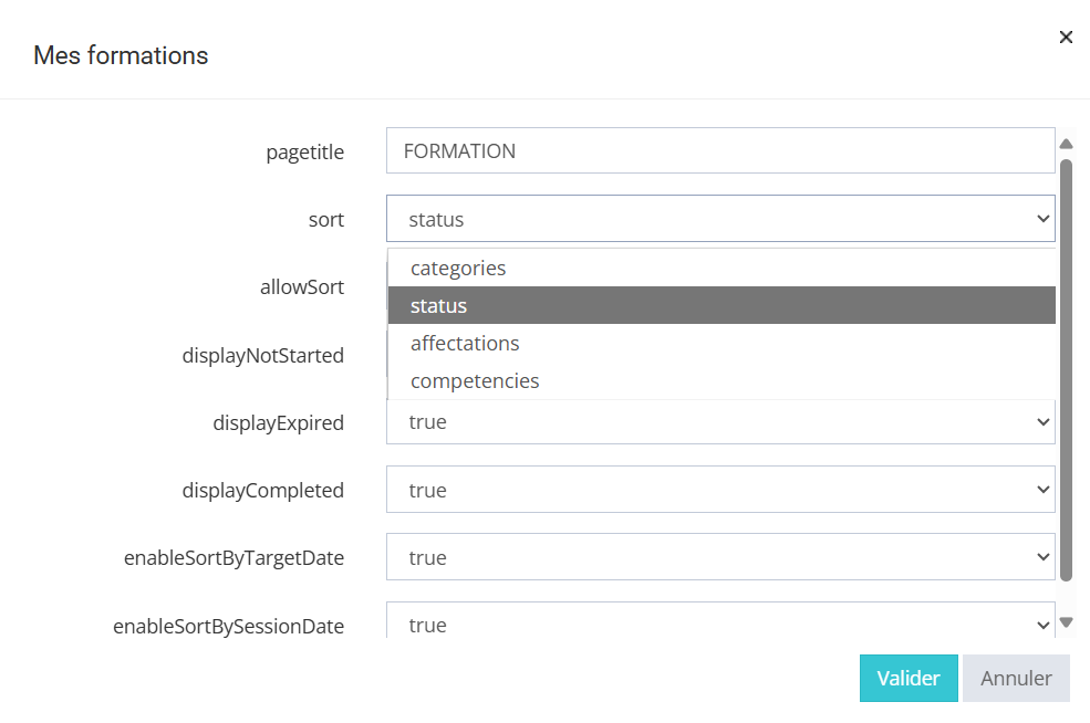 Dans ces catégories on peut choisir le nom, trier par statut, compétences.... Pour que les autres catégories apparaissent sur la page en front office, il faut sélectionner "true". |
