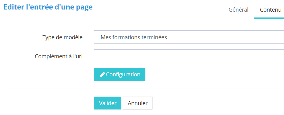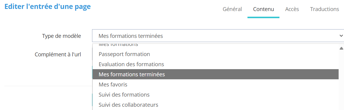 Dans l'onglet contenu, on choisit parmi la liste le type de modèle "Mes formations terminées " |