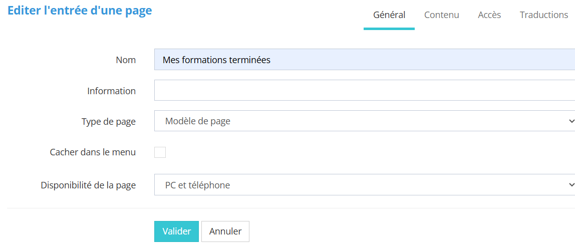 Dans l'onglet général, on choisit le nom et on sélectionne le "modèle de page". |