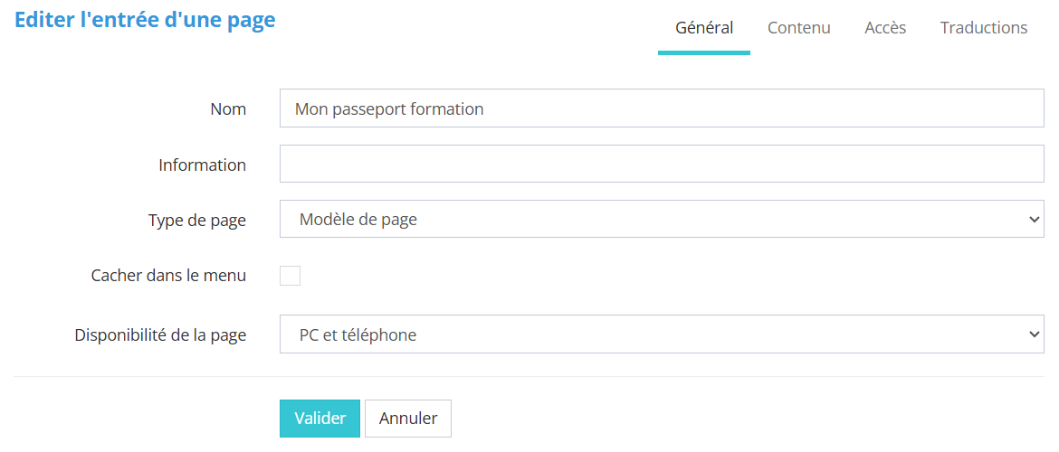 Dans l'onglet contenu, on choisit parmi la liste le type de modèle "Passeport formation " et on clique sur valider. |