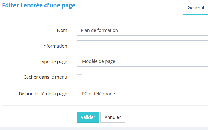 | Dans l'onglet général, on choisit le nom et on sélectionne le "modèle de page" . |