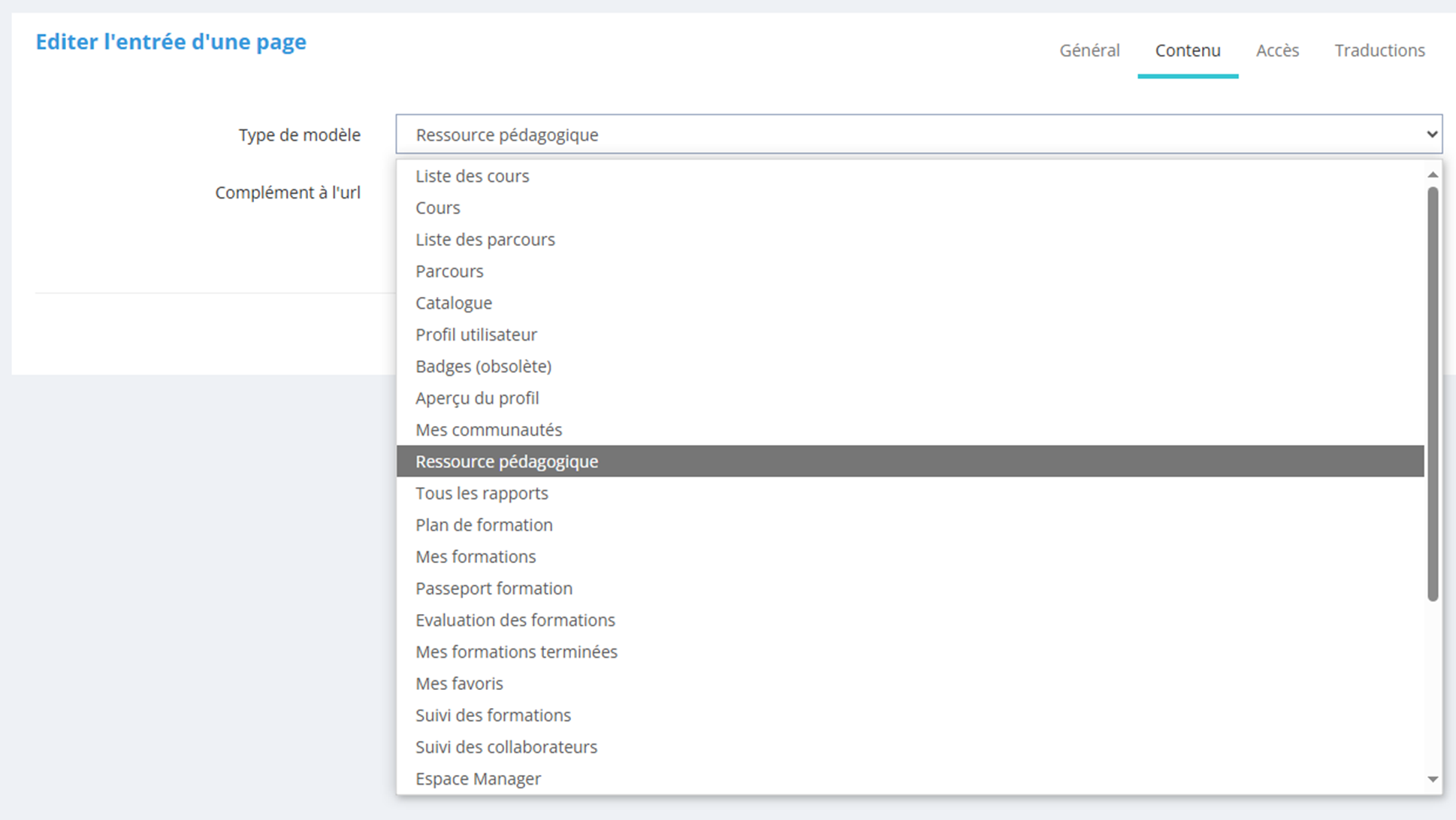 Dans l'onglet contenu, on choisit parmi la liste le type de modèle "Ressource pédagogique" |