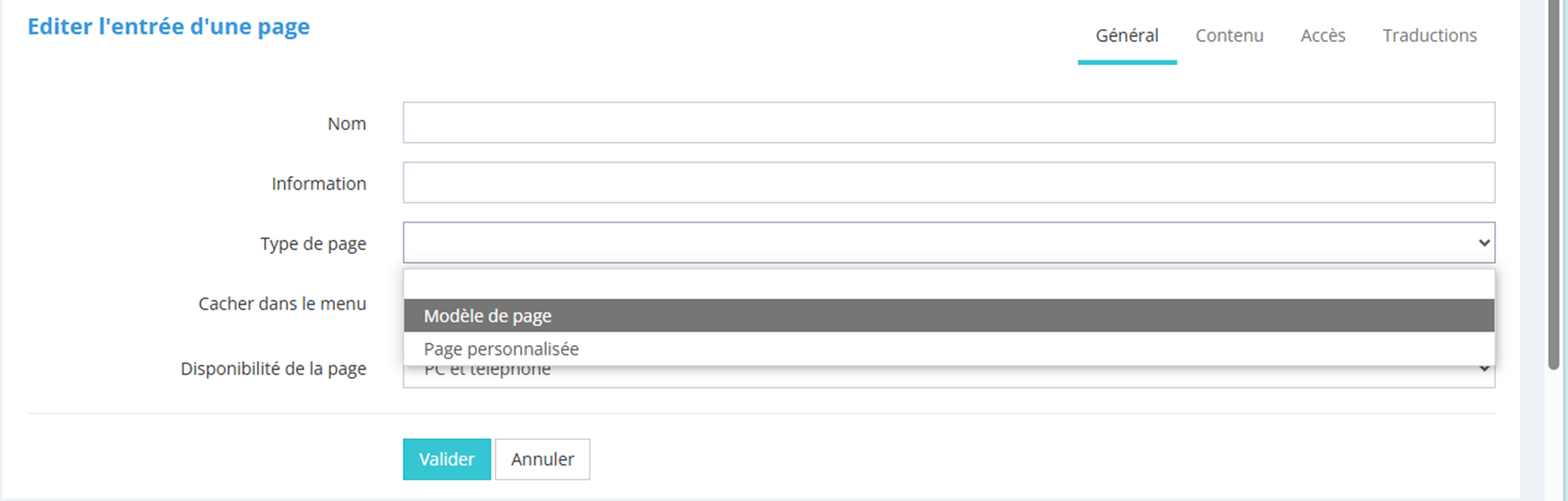 Dans l'onglet général, on choisit le nom et on sélectionne le "modèle de page". |