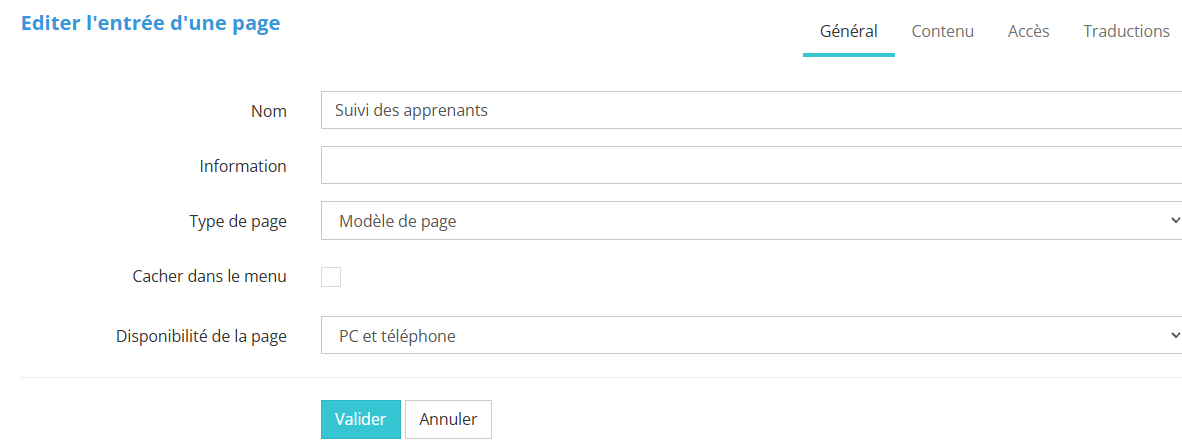 Dans l'onglet général, on choisit le nom et on sélectionne le "modèle de page". |