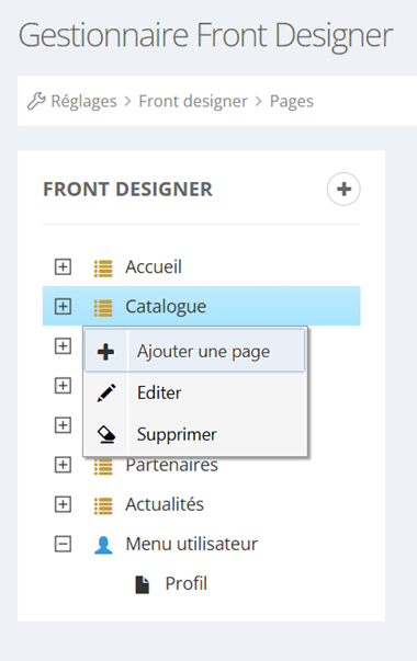 Au niveau de l'onglet Réglages, Front Designer, Pages, après avoir sélectionné la section où l'on souhaite ajouter cette page, on clique doit sur la souris et "ajouter une page". |