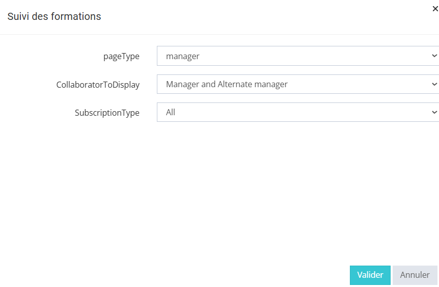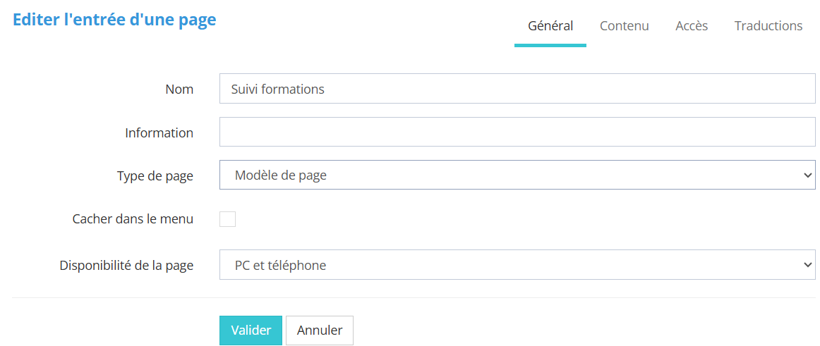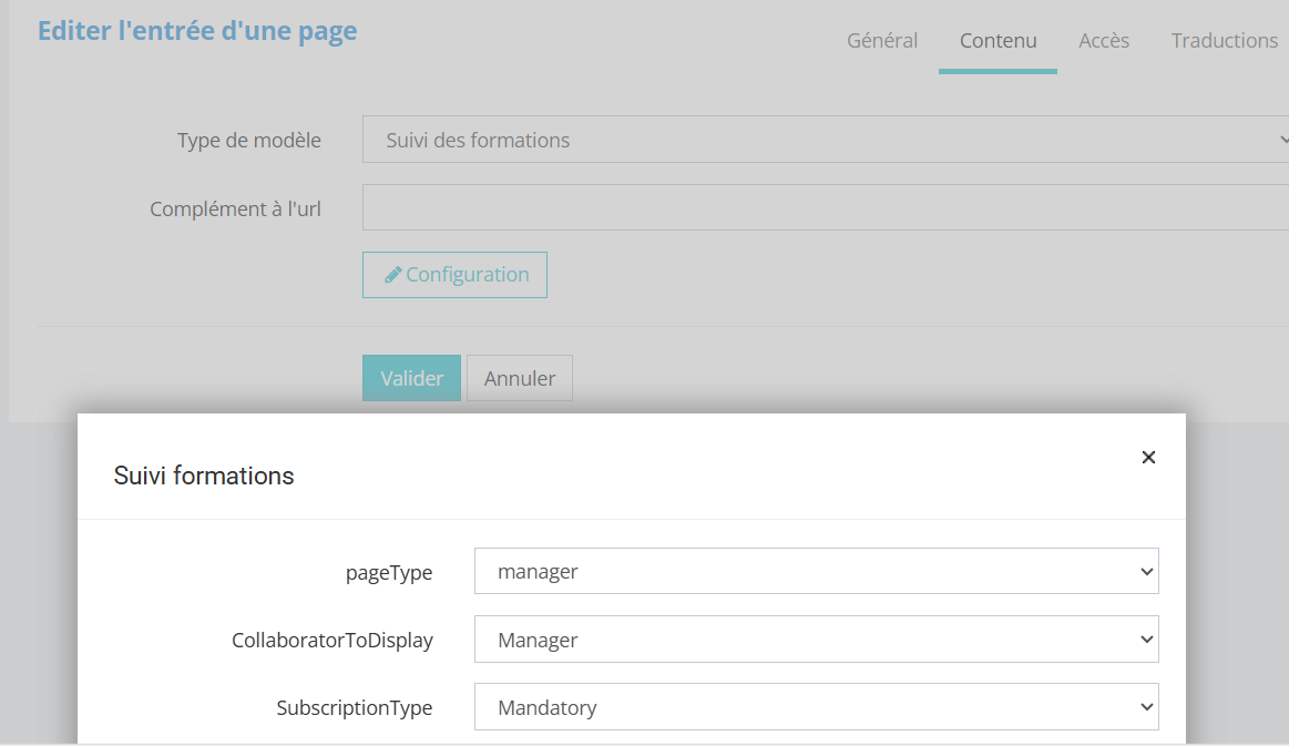 Dans l'onglet contenu, on choisit parmi la liste le type de modèle " Suivi des formations " |