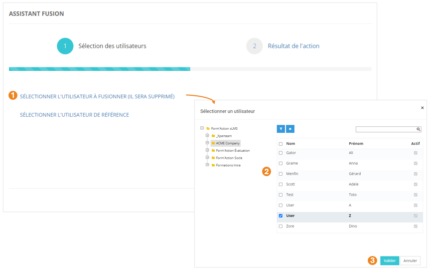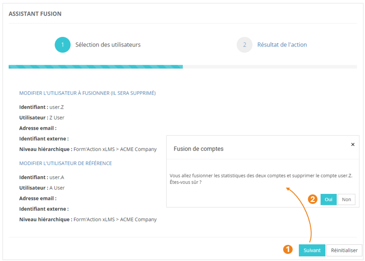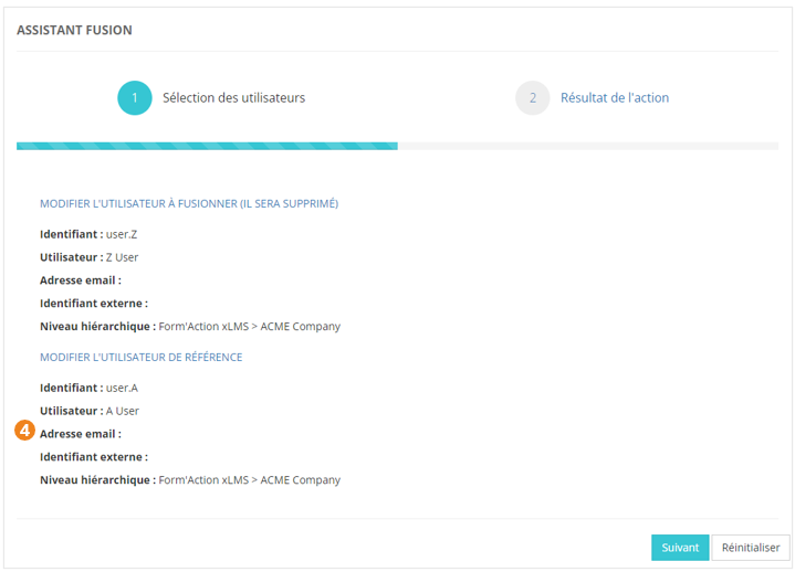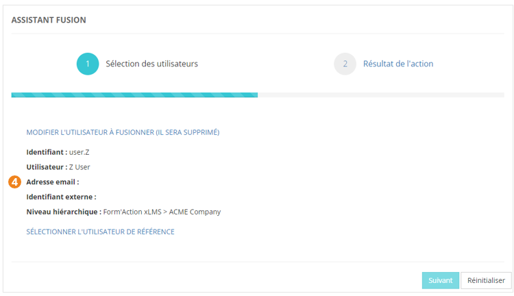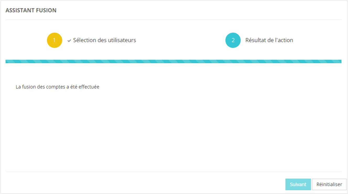 Le bouton Réinitialiser ramène à l’écran de sélection des utilisateurs de l’assistant, afin de procéder à une nouvelle fusion, via l’assistant.