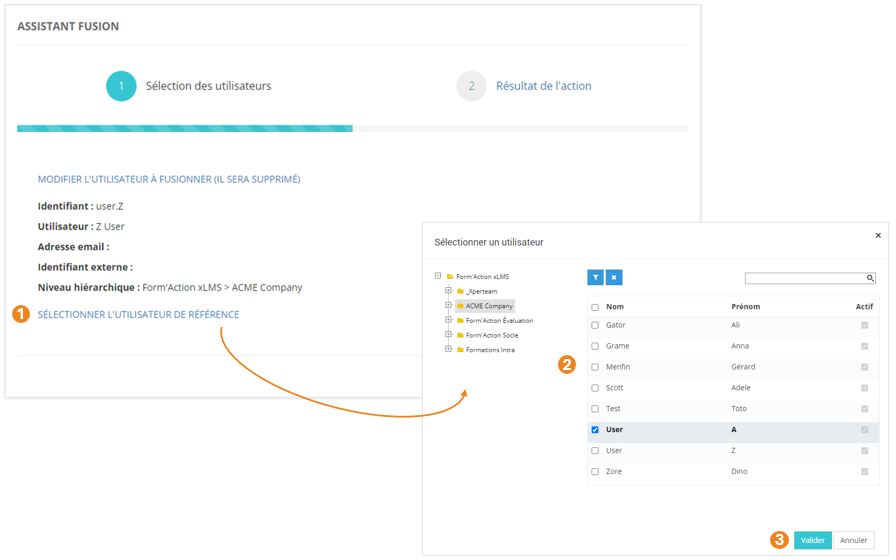 En théorie, si la fusion est faite correctement, les données liées aux cours et parcours de l’utilisateur à supprimer (User Z)  apparaitront dans les statistiques de l’utilisateur à conserver (User A).