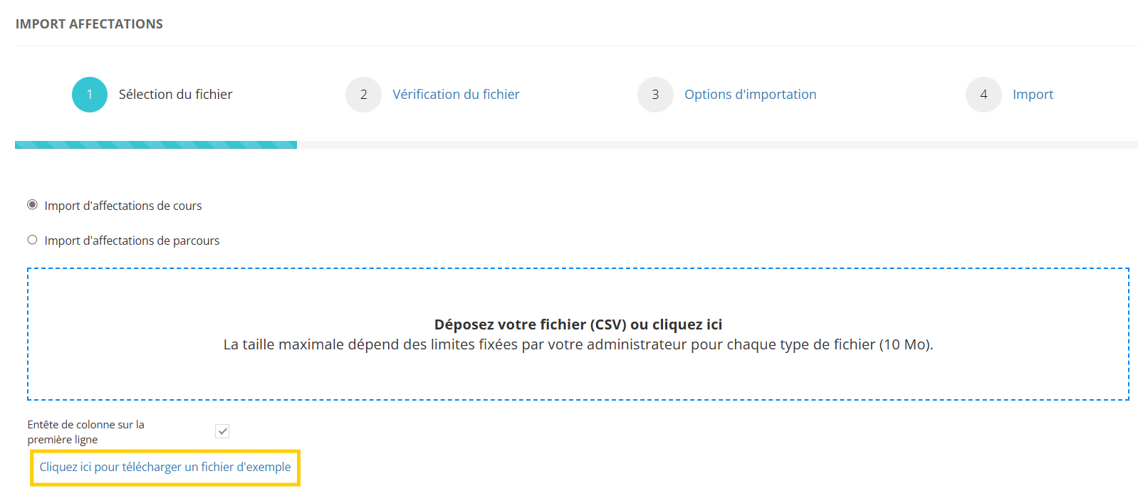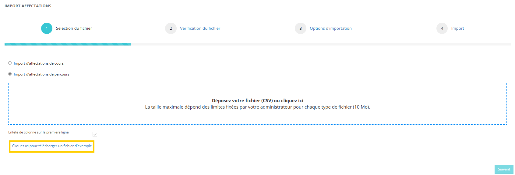 Le fichier d'import doit respecter certaines règles. Afin d'avoir un fichier valide, il est recommandé dans un premier temps de télécharger un fichier d'exemple.