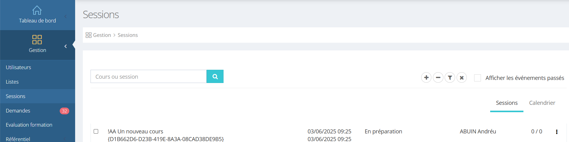 Les sessions importées se retrouvent dans Gestion>Session