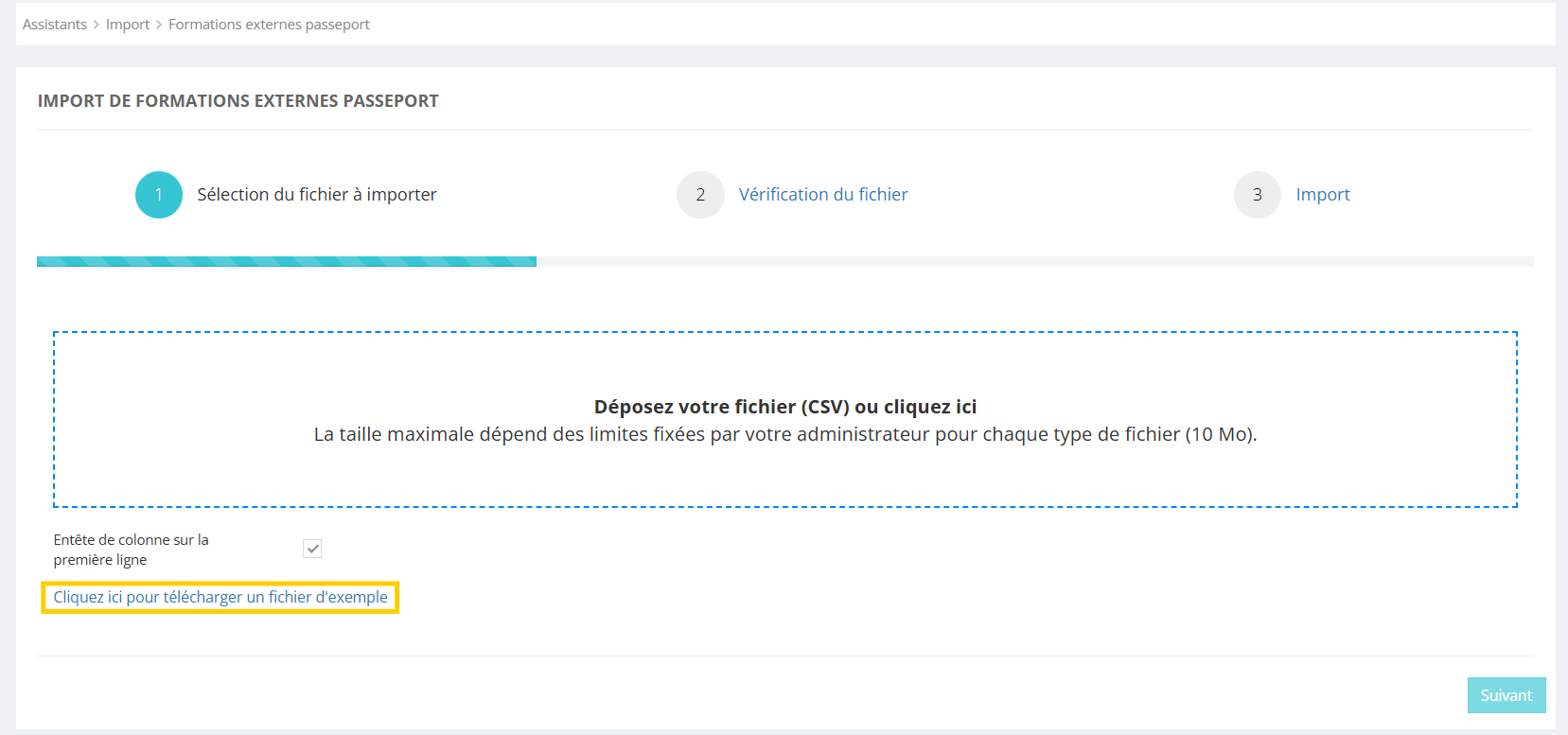 Le fichier d'import doit respecter certaines règles. Afin d'avoir un fichier valide, il est recommandé dans un premier temps de télécharger un fichier d'exemple.