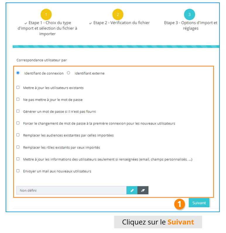 Lors de cette étape, on définit les règles qui vont s’appliquer lors de l’import du fichier apprenant.