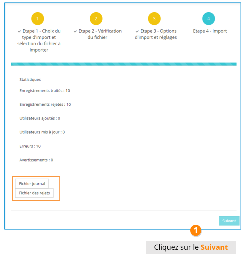 Si l’import n’est pas complétement réussi, le nombre d’erreurs et d’avertissements seront indiqués. Les erreurs empêche l’import de l’apprenant (exemple Organisation de l’apprenant non trouvé), l’avertissement n’est pas bloquant (exemple : manager non trouvée).