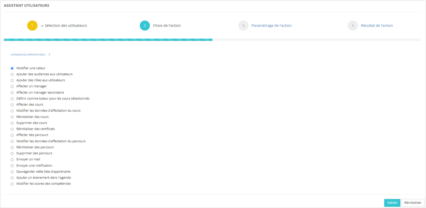 L'assistant Utilisateurs vous permet d'effectuer, après avoir sélectionné des apprenants, un certains nombre de tâches d'administration. Vous trouverez la liste de toutes les actions possibles plus loin dans la fiche.