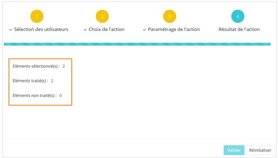 Le bouton Réinitialiser ramène à l’écran de sélection des utilisateurs de l’assistant, afin de paramétrer une nouvelle action de modification sur le même groupe ou un groupe différent, via l’assistant. Il n’annule pas la dernière action.