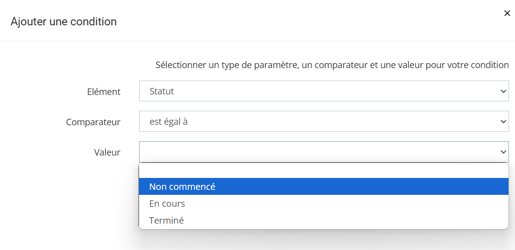 Vous pouvez définir que la notification parte si le statut de l’apprenant est égal ou différent de Non commencé, Commencé, Terminé.