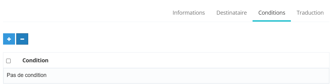 Dans l'onglet Conditions, on définit les conditions d'envoi en cliquant sur le bouton +