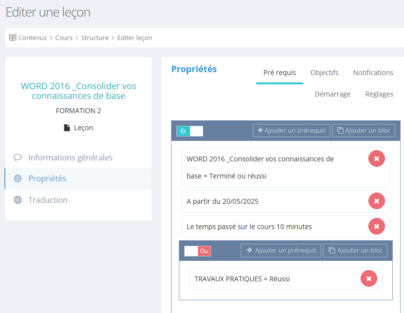 Avant d’ajouter des prérequis à des leçons, vérifiez bien que ce