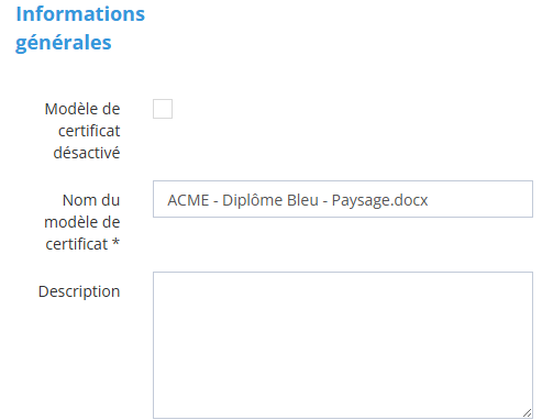 Il est composé de texte, d’image et de champs dynamiques qui vont être interprétés lors de son édition (ex : le nom, le prénom, le titre du cours…)